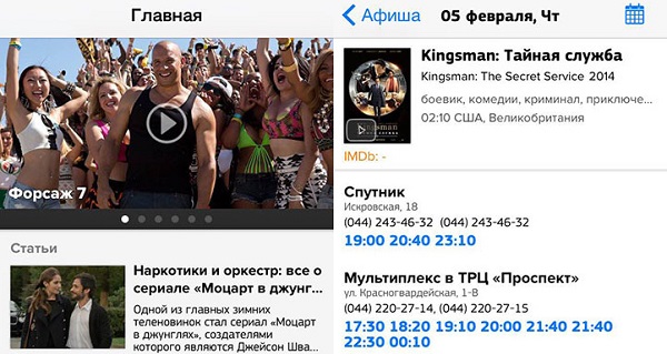 При выборе в разделе "Афиша" желаемого фильма, будет выводиться список кинотеатров, в которых он идет со временем начала сеансов. Во вкладке "Скоро в кино" расположен список ближайших фильмов с сортировкой по дате начала проката в Украине.