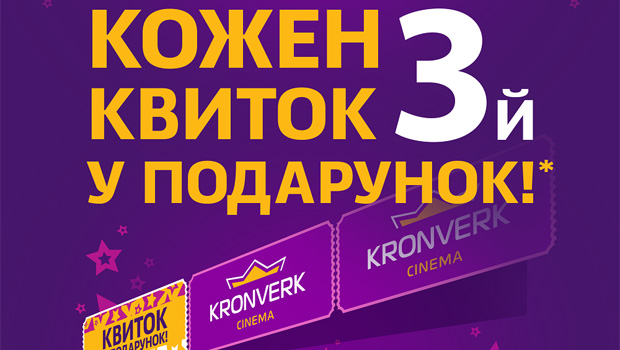 С сегодняшнего дня и до конца августа в кинотеатрах сети Kronverk Cinema в Киеве и Харькове действует акция. Купив два билета на разные фильмы, третий можно получить в подарок.
